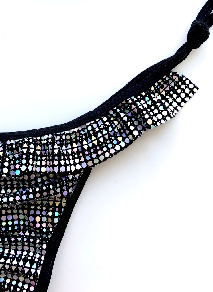Bikini de tela holográfica en base negra con corpiño armado, bombacha colaless y volados en ambas piezas.