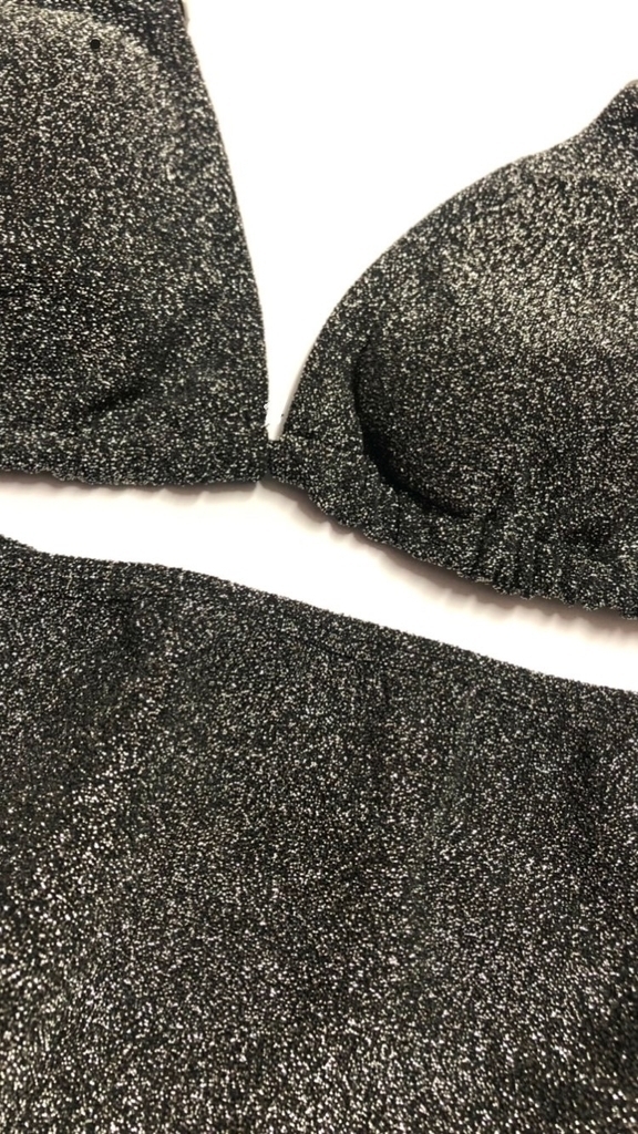 Traje de baño de dos piezas, de lurex color plateado en base negra.