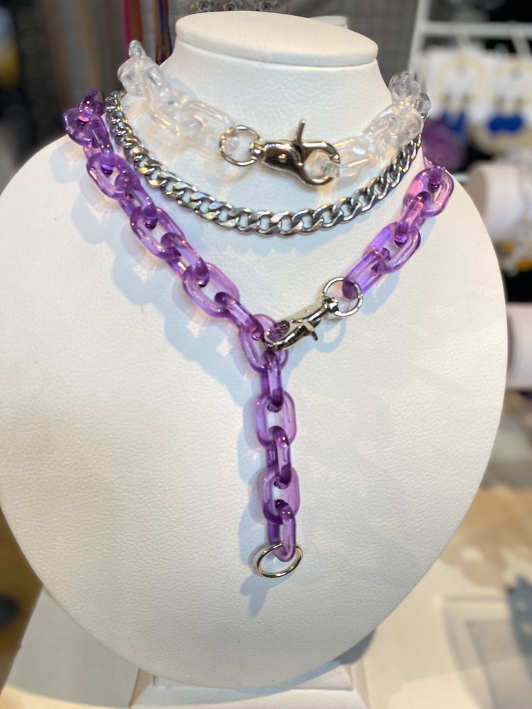 Disponibles en trasnparente y naranja. Las fotos donde aparecen varios collares juntos son solo una inspiracion para que veas cómo combinarlos, pero el recio es por un collar acrílico solo.